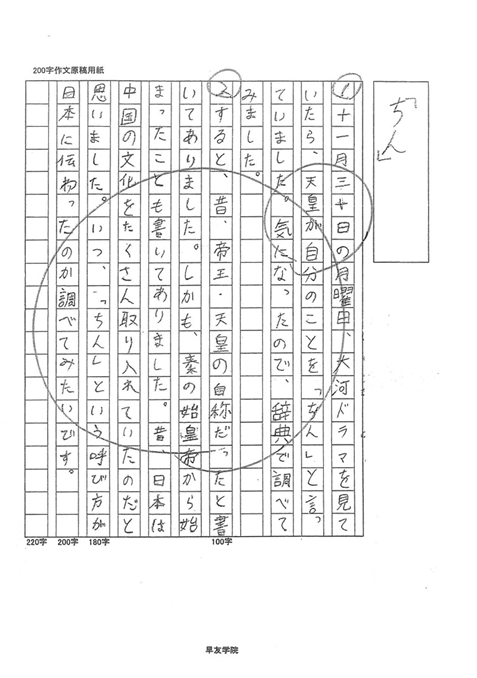 一段落に事実を述べていて、「辞典で調べたこと」までが事実ですね。二段落に「ちん」についての結果や学んだことが書かれています。そして最後の一文には「今後どうしていくのか」も入れ、次につなげています。しっかり自分のことが表現されていました。とても分かりやすい作文です。大人でも興味がわきますね。