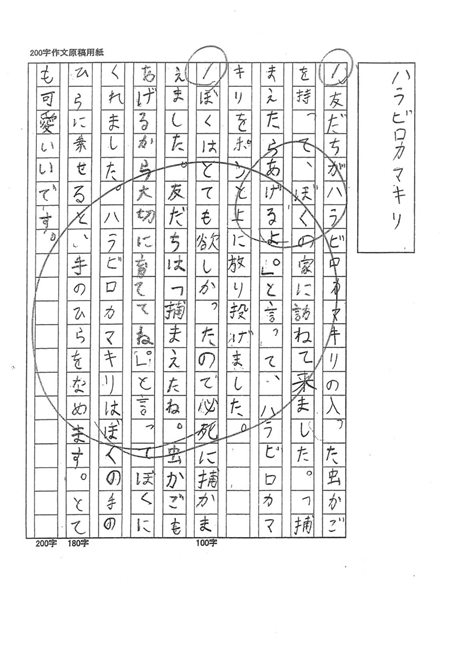 昆虫が大好きな生徒です。一匹のカマキリについて、友達とのやり取りが述べられています。一段落は事実を述べ、「放り投げました」までが事実です。二段落はそのこのやりとりと思いです。おもいやりと優しさがにじみ出ています。