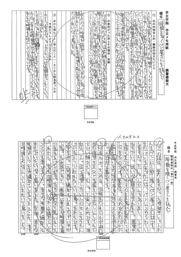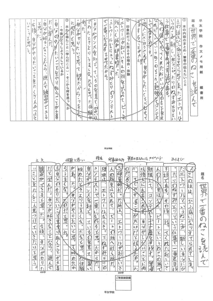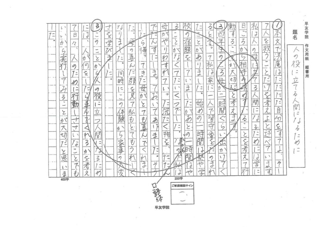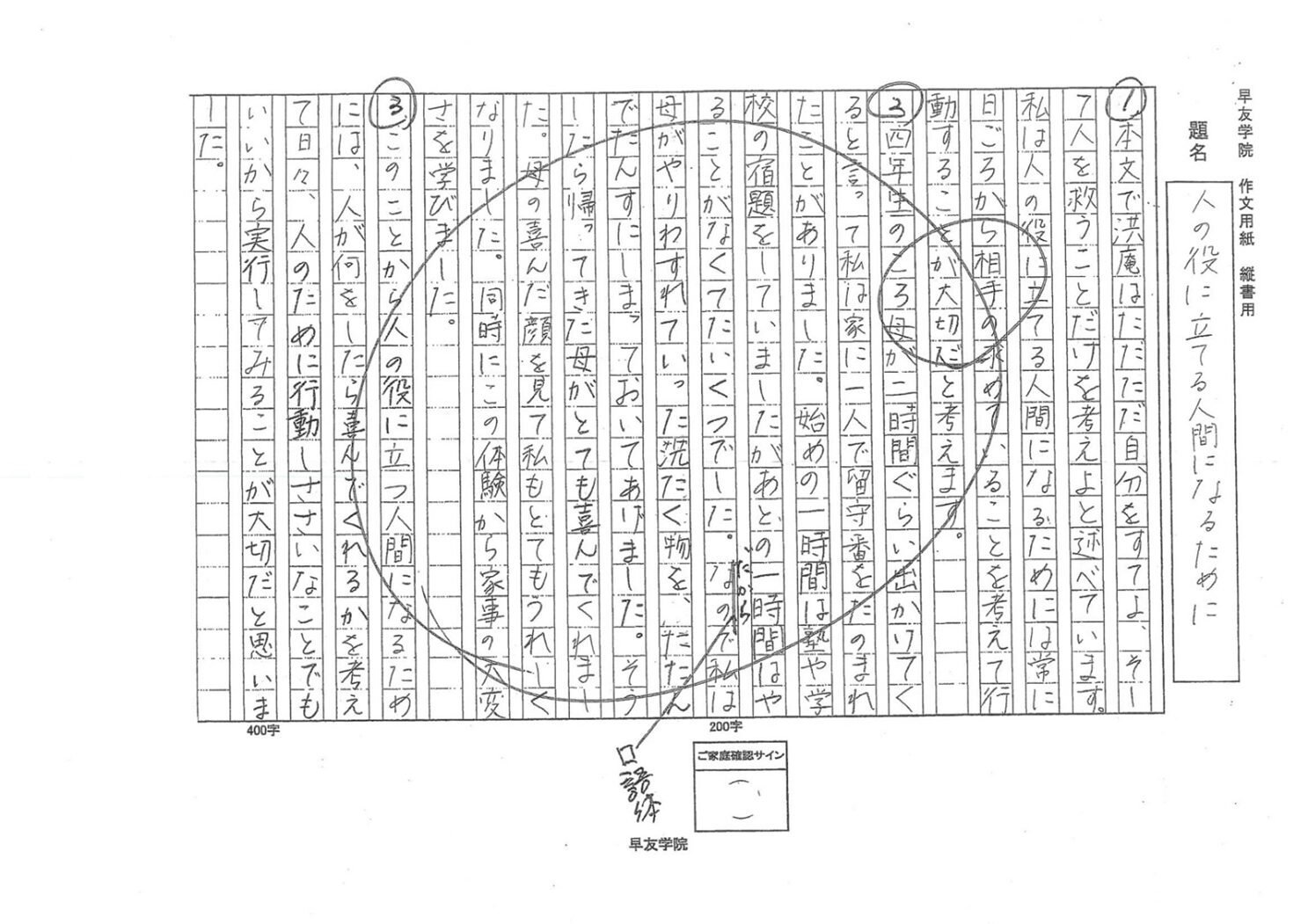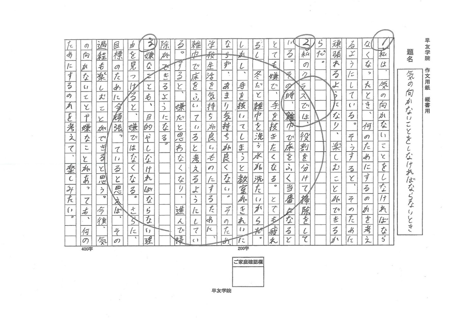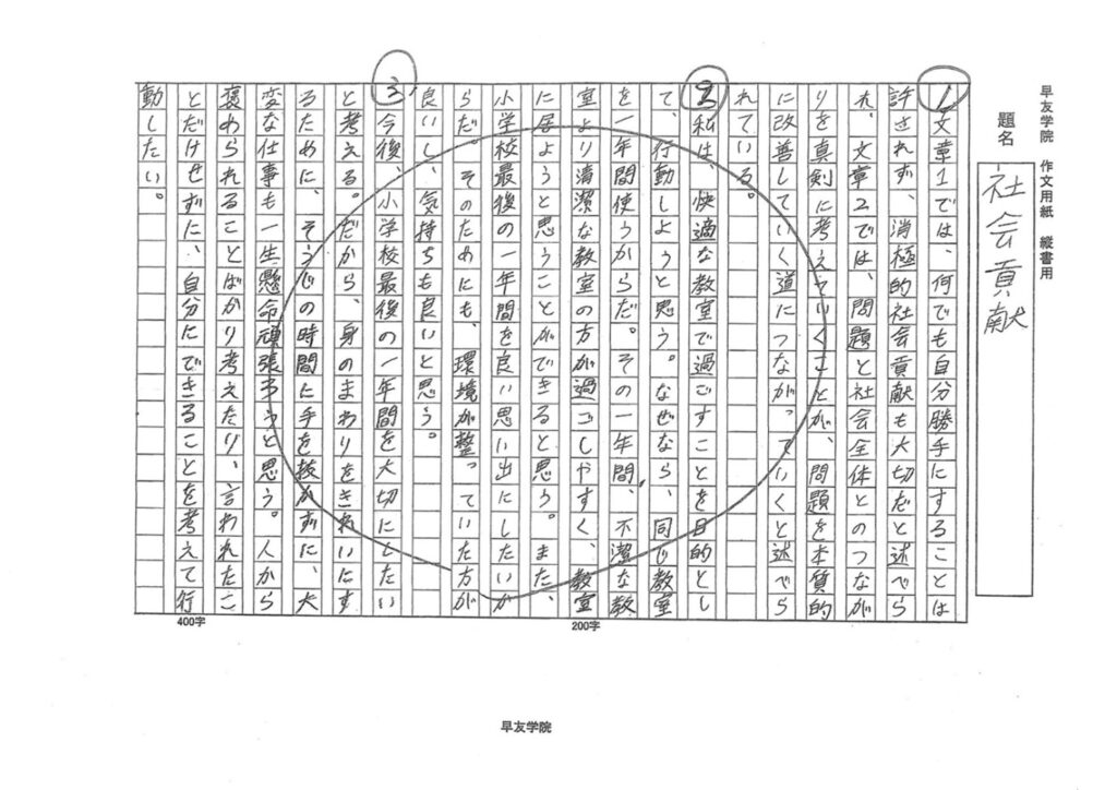 徹底した添削指導を元に、確実に書ける生徒へ変貌します。「全員、作文が書けるようになった!」「全員、記述問題が解けるようになった!」「毎年、特訓生100人全員がミニ小論文(400字程度)を15分で書き終える凄さ!」「書けるから他教科もできるようになった!」「人間力アップにも繋がる!」ーこのようなことは何も不思議ではありません。早友学院では当たり前です!